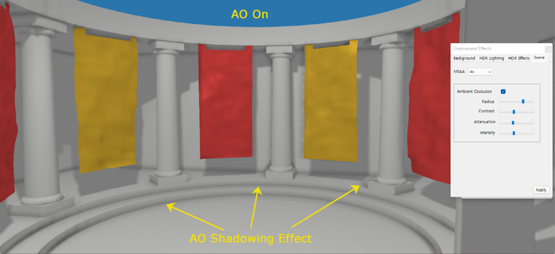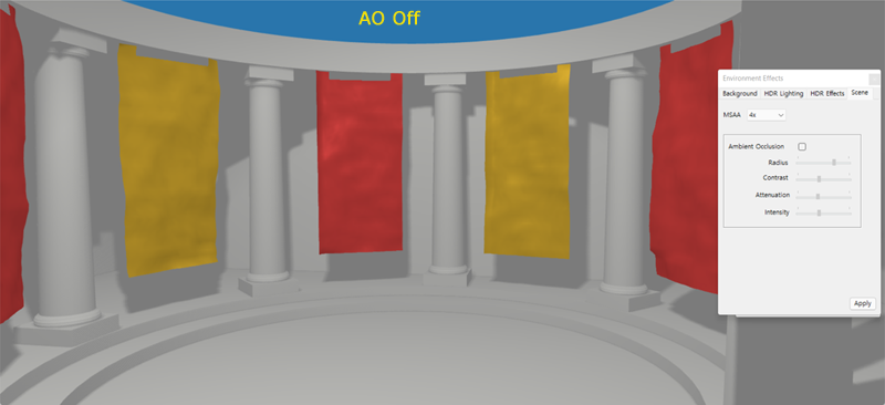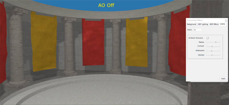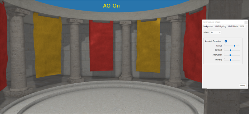 Higher sample count increases anti-alias effect improving appearance. Example showing aliasing effects without MSAA and with MSAA enabled Ambient Occlusion Ambient Occlusion (AO) is an approximate global illumination technique to deterime how exposed each point in a scene is to ambient lighting. AO feature adds subtle shadows to scene in regions which would naturally recieve less ambient light. Common areas effected by AO are interior corners of a room and around base of objects placed on ground, floors and tables.