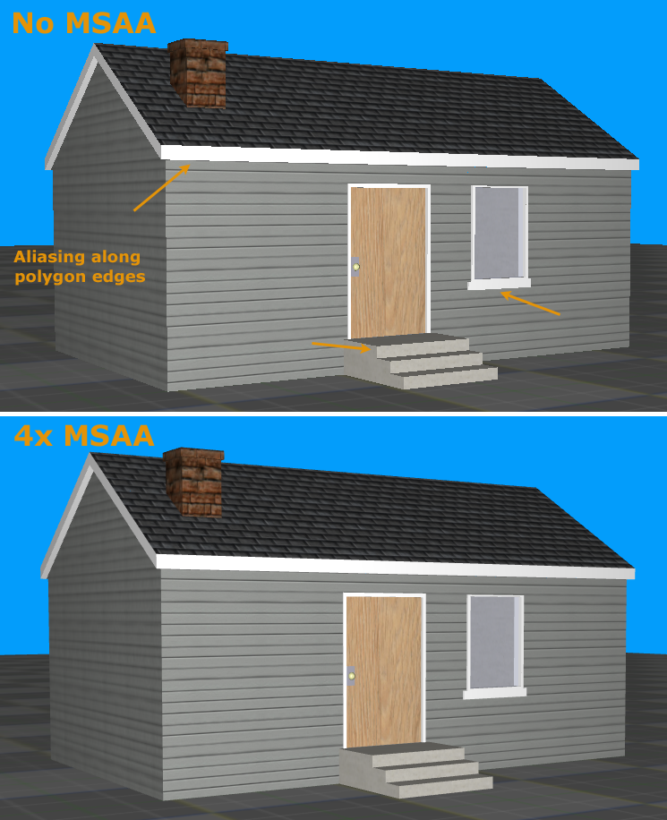Scene Effects apply to entire rendered scene and are part of the Environment Effects dialog.MSAA Multi-Sample Anti-Alias is an effect that reduces appearance of jagged edges along adjacent polygons rendered on screen. Anti-alias also reduces flickering that can occur between contrasting colors along polygon edges while the view is moving.